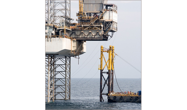 Once vertical, stabilizing rigging and lift rigging were attached and the TTS lifted clear of the barge using the Transocean GSF 136 jack-up drilling rig.